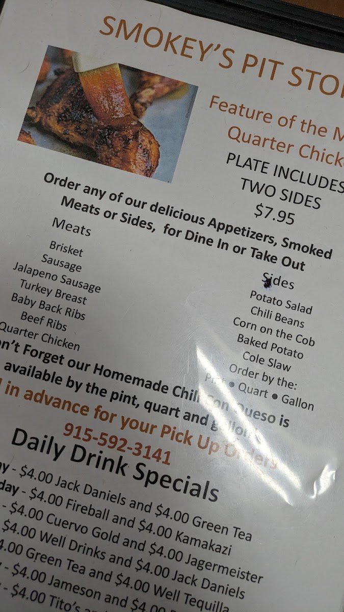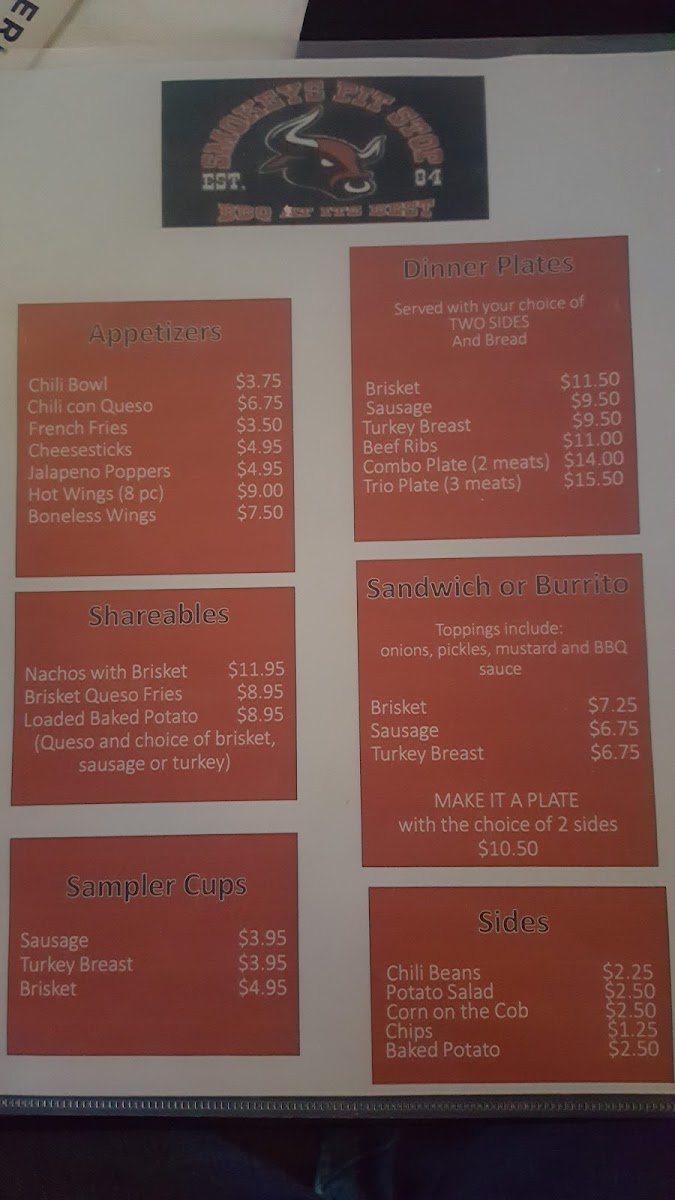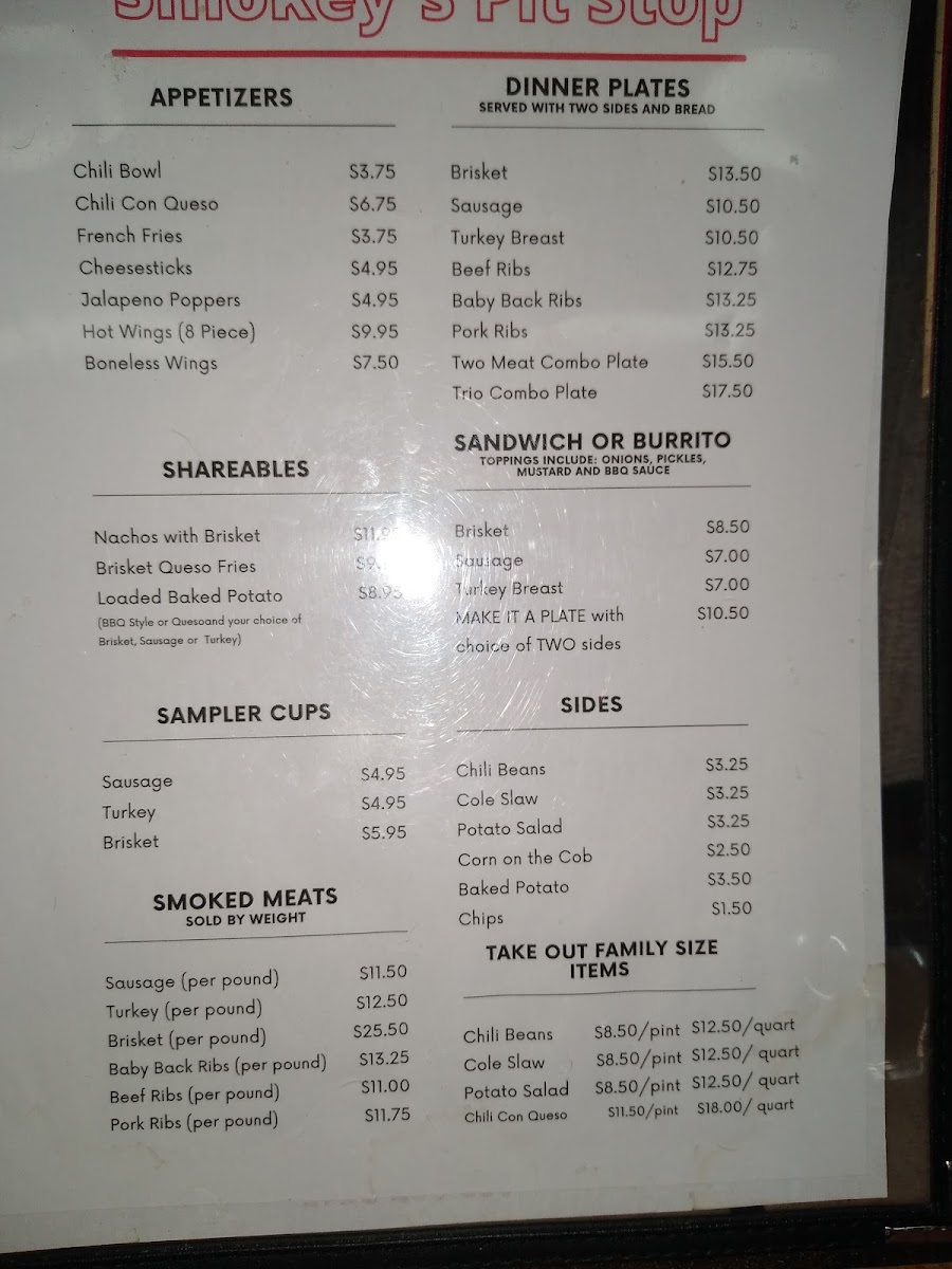 Smokey's Pit Stop Menu