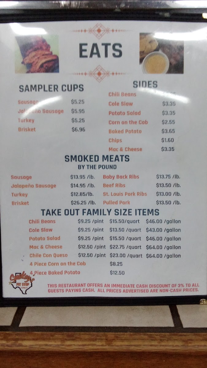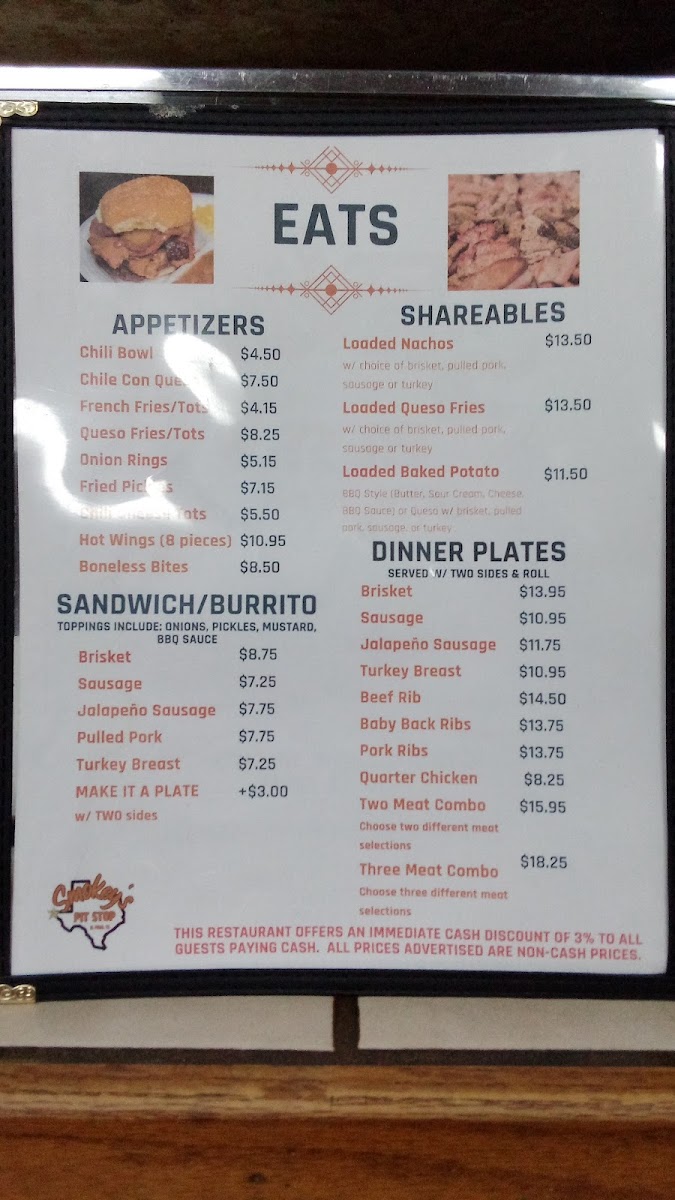 Smokey’s Pit Stop offers a straightforward and hearty barbecue menu that feels right at home in its casual, relaxed setting. The menu features classic Texas-style smoked meats and satisfying sides that invite you to slow down and enjoy a comforting, flavorful meal.